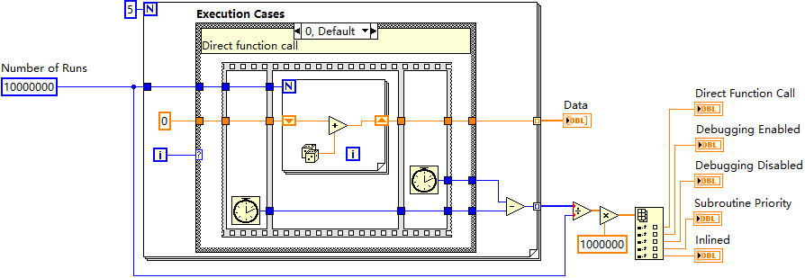 对比:性能优于 “Debugging Enabled”,但逊于 “Subroutine Priority” 和 “Inlined”;与 “Direct Function Call” 相比,因子 VI 调用存在,性能仍有差距。