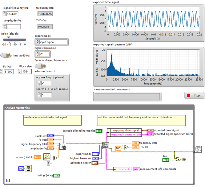 在电力、音频等工程领域,谐波失真是指信号中除基波外,存在整数倍基波频率的谐波成分,总谐波失真(THD)用于量化谐波成分相对于基波的比例,反映信号失真程度。本内容借助 LabVIEW 的Harmonic Distortion Analyzer VI,对含失真的模拟信号进行分析,获取基波频率与总谐波失真(THD),还可调节噪声等参数观察对 THD 的影响,选择信号导出模式。